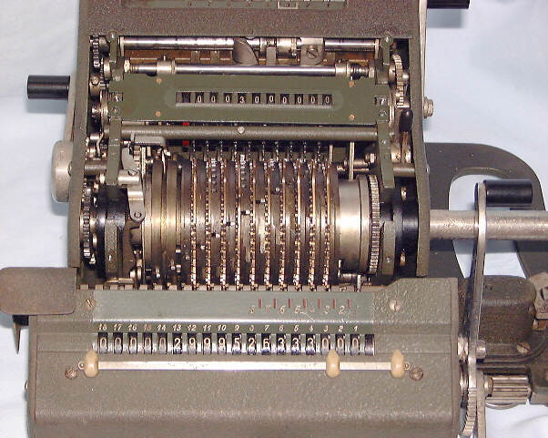 The illustration shows the cylinder with the line of transfer gears and carry cams lying between the cylinder and the array of figure wheels of the output register (18 figures!). To the right of the machine are the 9 wheels of the second register, used for multiplication and division
