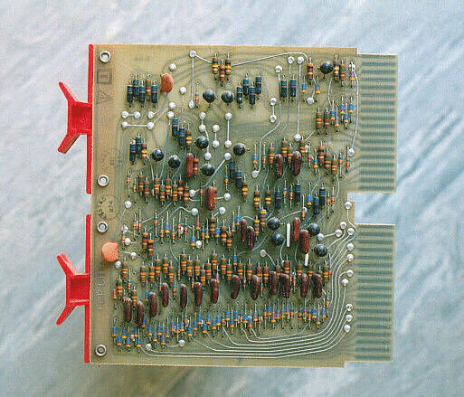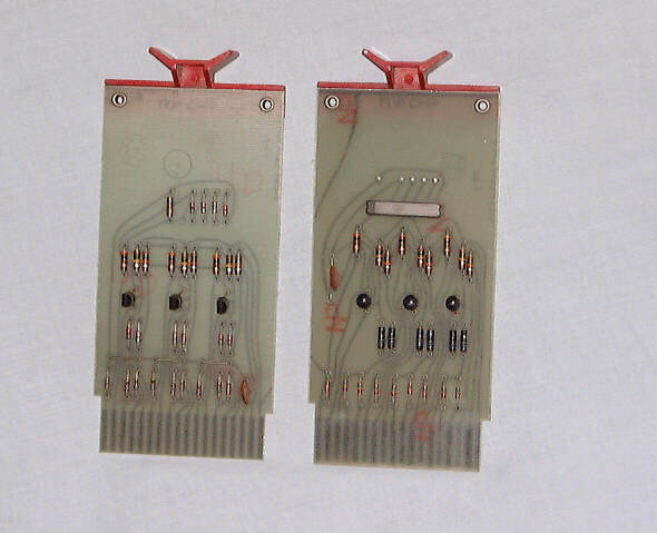 The picture shows two S111 modules. The one on the right has the FLIP CHIP 'integrated circuit', the one on the left is its discrete component counterpart. Notice that the board on the right still has the holes and circuit traces for the discrete components. The diode /resistor array was to provide a -3v clamping level for the logic.