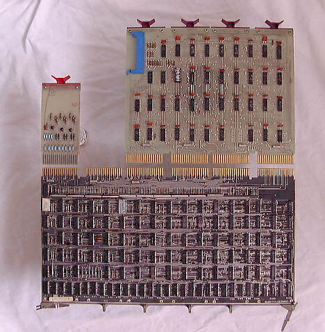 Note: There is, unfortunately, one board type missing from this sequence. The PDP-8/I and PDP-8/L computers used single height boards which housed small scale TTL integrated circuits, rather than the individual components used on the PDP-8 board illustrated above.