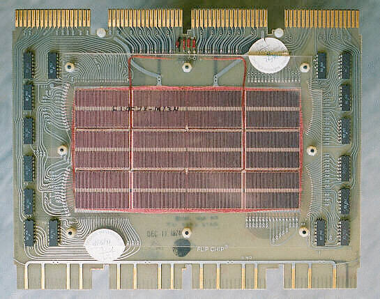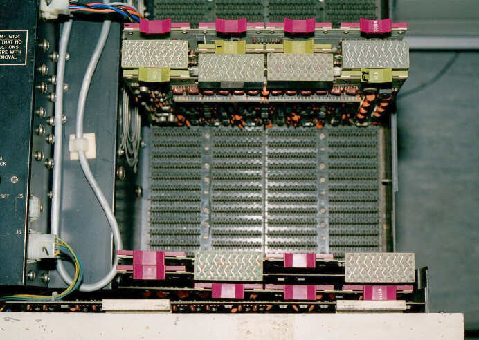 The 4K core memory stack. In the centre, under a protective perspex screen, are 49,152 ferrite rings (12 × 4096) and each one has three wires threaded through it. The bundles of wires can be seen as the pinkish strands round the edge of the core.