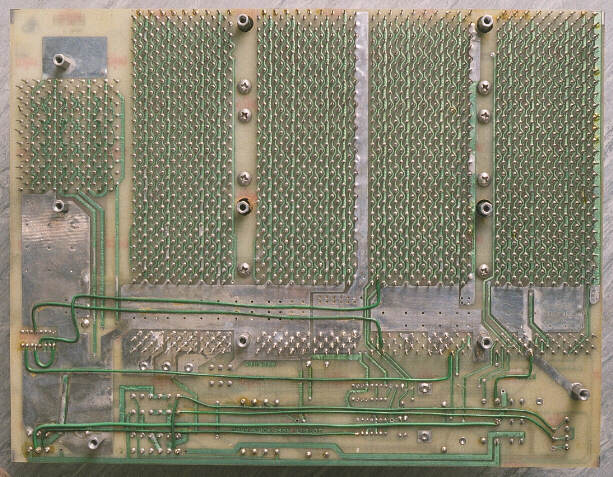 The backplane, removed from its case. The omnibus is largely formed in one block and has an additional block of connectors tacked on to the side. Slots 1-3, which take the CPU and option boards 1 & 2 are quad, as are slots 9 to 12. Slots 4 to 8 have 5 sets of connectors and are for core memory. There does not seen to be an accepted term for these.