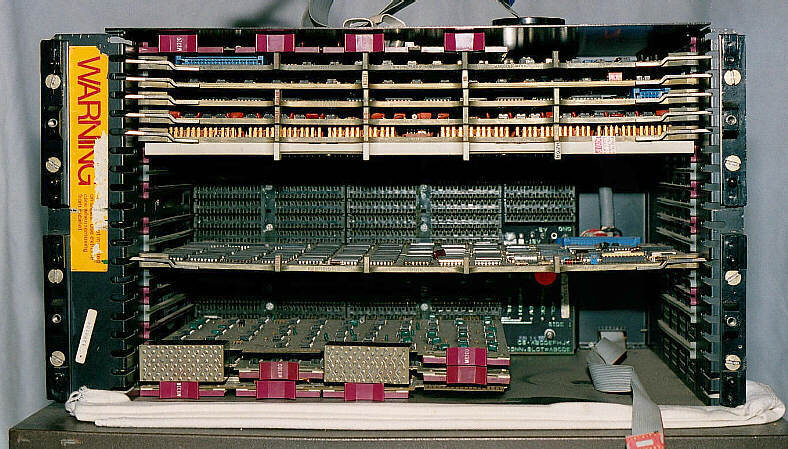Looking into the case of the 620. The first thing to notice is the presence of quad boards with MAGENTA handles! This machine is fitted with an 8/E CPU.