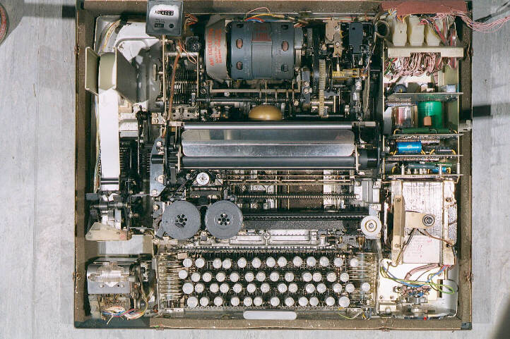 The teletype with its cover removed. On the far left from top to bottom: An almost used reel of paper tape, feeding into the punch. Then there is a small gap and the block at the bottom is the papertape reader. When operating, paper tape is fed to this reader from below.