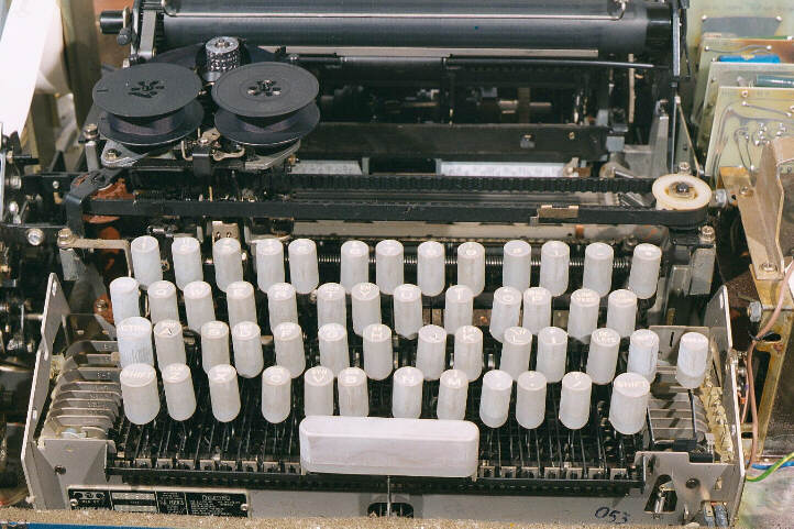 At the rear left, behind the ribbon spools, can be seen the cylindrical type wheel. At the front is the keyboard and at either side of this the (silver) ends of the coding bars can be seen.