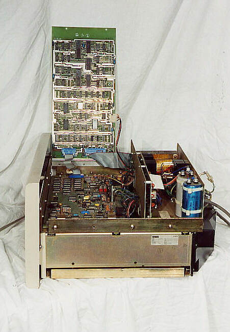 The power supply is at the rear of the drive, (right of the illustration). The control circuitry is mounted on two PCBs, which hinge open as shown.