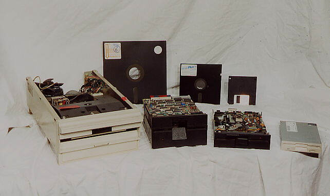 From left to right in the front row: An 8 inch drive, a 5¼ inch full height drive, a 5¼ inch half height drive and a 3½ inch 1.44 MB drive.