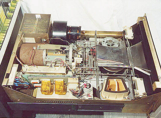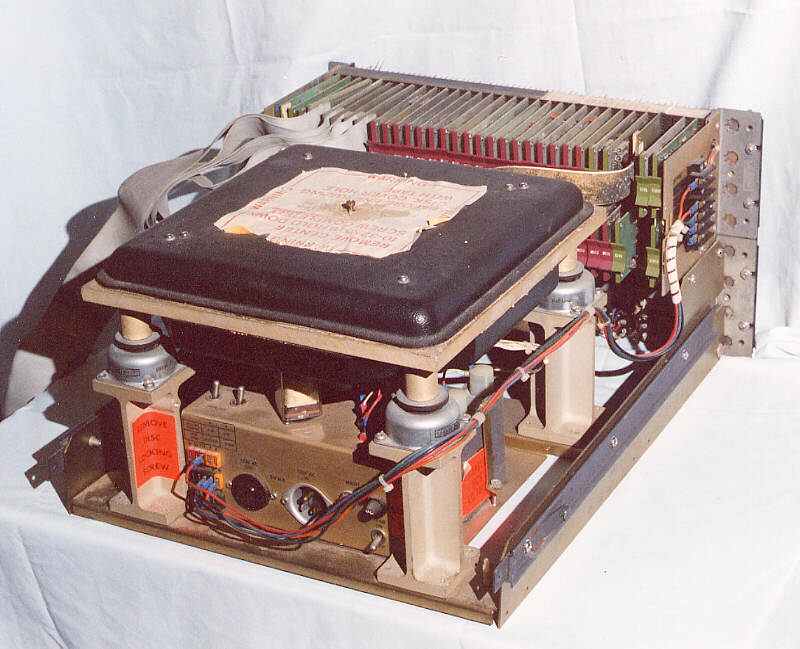 An RK05 disk drive with its cover removed. The removable disk is mounted in a plastic cartridge and fits into the wire rack visible on the right of the drive. The heads are positioned by the rust coloured drive unit, centre left of the illustration. Sadly, this drive has suffered in storage and the rust 'colouration' is genuine rust.