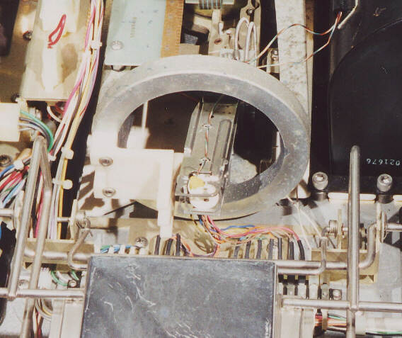 The heads are visible within the ring of the head positioning assembly. head detail (54703 bytes) As the heads are with drawn from the disk and retract into the ring, projections on the side of the heads make contact with the plastic bracket visible on the left of the ring and this forces the heads safely apart.