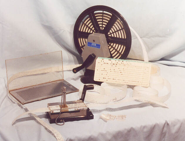 Both eight hole and five hole paper tape are illustrated, but you need to look very closely to see the difference. A length of five hole tape runs on the left of the illustration from behind the card alignment checker. The loose coils in the centre and the tape in the editing jig are eight hole tape.