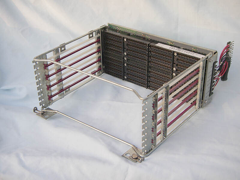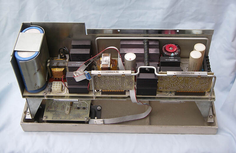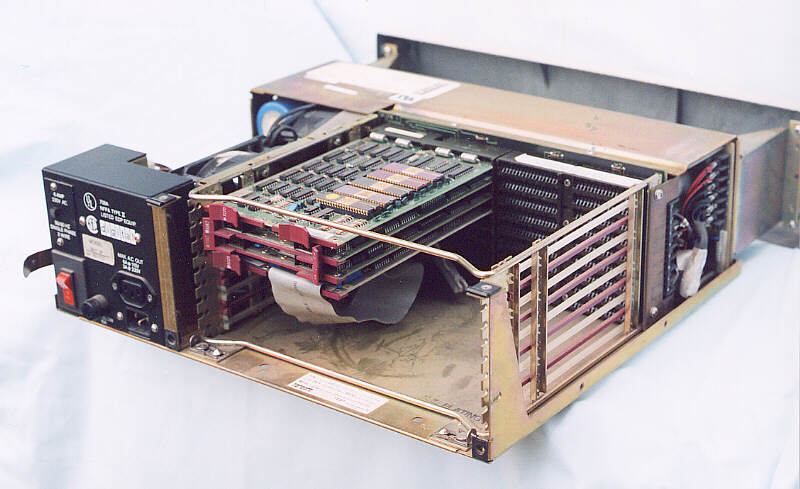 The unit with the circuit boards removed. This clips onto the base of the computer and the power supply attaches to the backplane to form the front of the computer. Two fans are fitted to the side of this unit to provide cooling air for the modules and for the power supply unit.