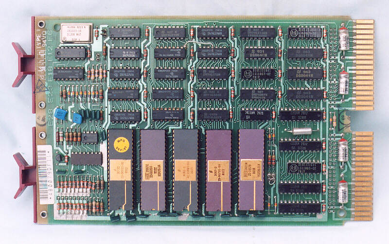 The PDP-11/03. There were two common processor options, dual height and quad height modules. This example has the LSI-11/2 processor, M7270, a dual height module. Below this are two M8047 CA modules, these are 16KW RAM with two serial lines each. The fourth module is M8029, an RX02 (dual 8" floppy disk) controller.